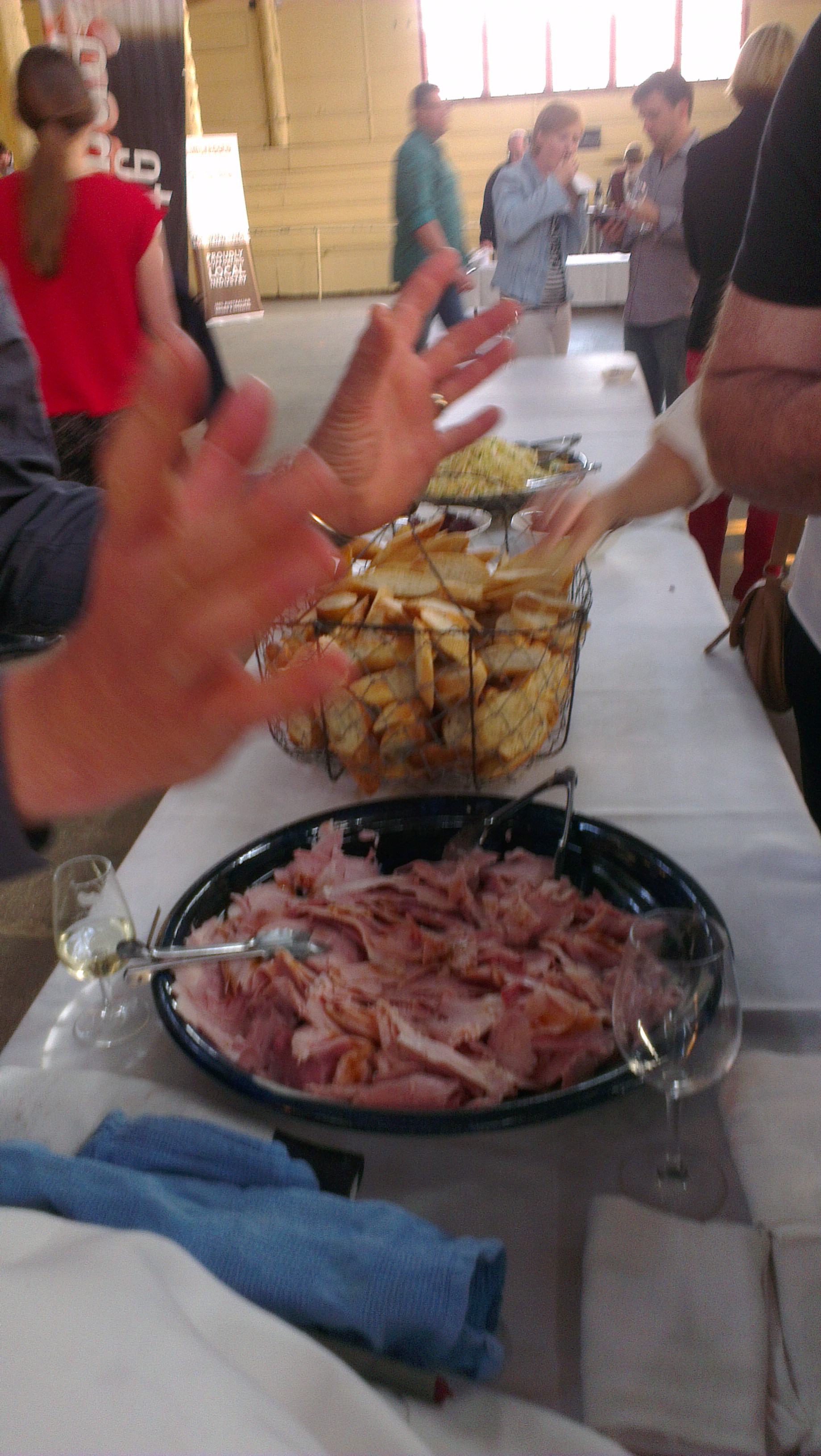 James Sweetapple, of Cargo Road Wines, somehow managed to get the job of carving the delicious hams from Trunkey Creek rather than pouring his own successful wines. I asked him why he volunteered for this culinary component: “This way, I get to see everybody and I get the good bits of the ham!” Can’t argue with that logic.